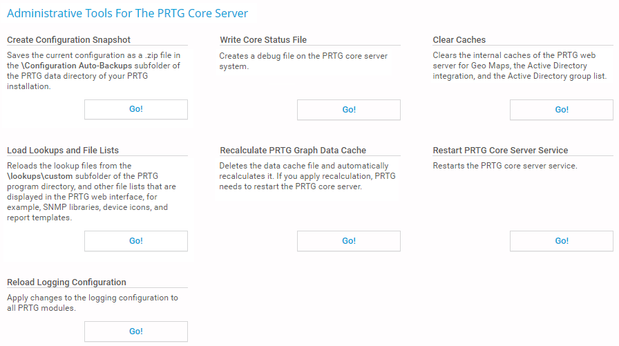 If you restart the PRTG core server service, all users of the PRTG web interface, the PRTG app for desktop, or the PRTG apps for iOS or Android are disconnected. Clicking Go! immediately restarts the PRTG core server service.