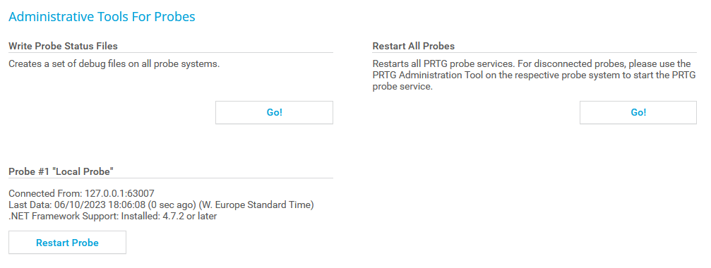 If you want to restart a single probe, click the corresponding Restart Probe button. Entries for every single probe follow.