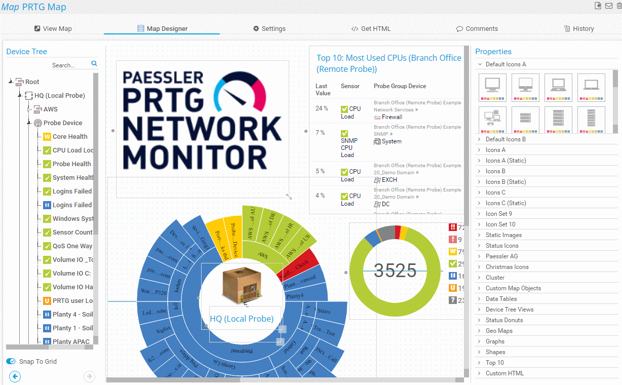 Choose from various icons that represent typical network devices in the style of the PRTG web interface. Default icons from category A also display object data. You can see the object name and a sensor overview for the object. This indicates how many sensors show a specific status. For some sensors, a mini graph is shown as well.