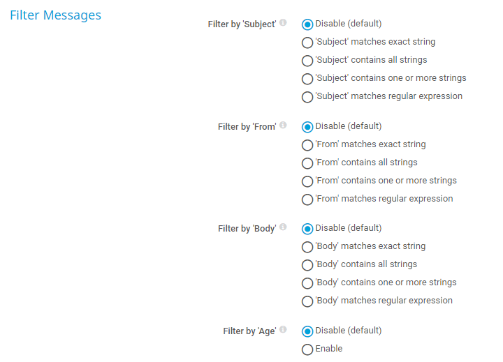 'Subject' matches regular expression: Filter emails whose 'Subject' field matches the defined regular expression.