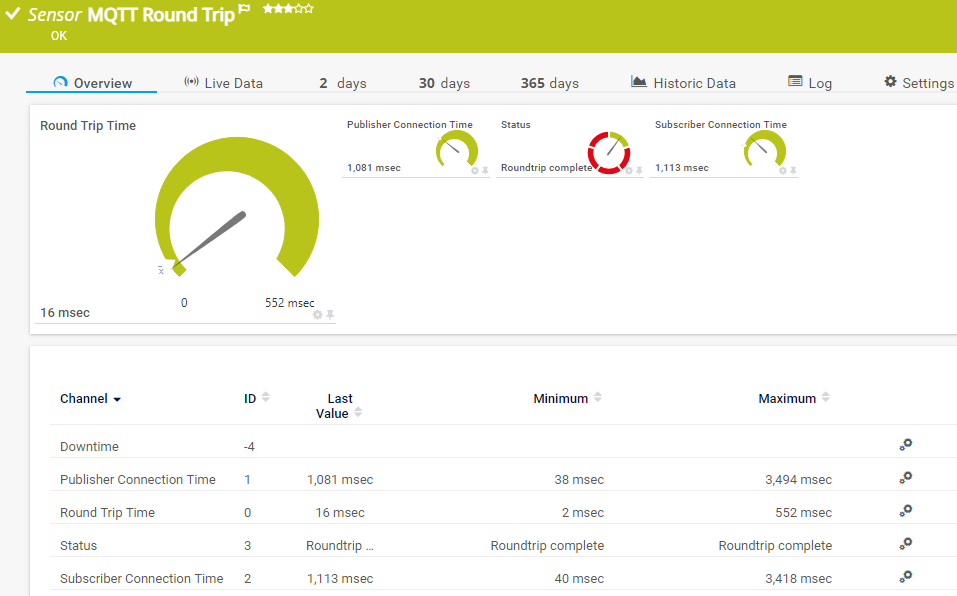 This sensor was converted to a new framework. MQTT Round Trip sensors that were added before PRTG 20.2.59 do not work anymore. We recommend that you pause existing sensors to keep their historic data. To continue monitoring, please add a new MQTT Round Trip sensor.