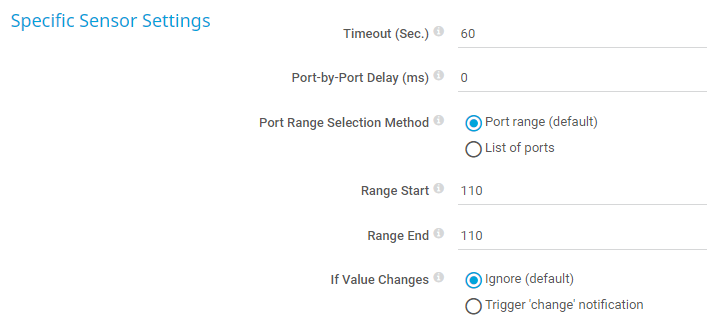 The Port Range sensor monitors a network service by connecting to various TCP/IP ports. It tries to connect to the specified TCP/IP port numbers of a device in succession and waits for the device to accept each request.