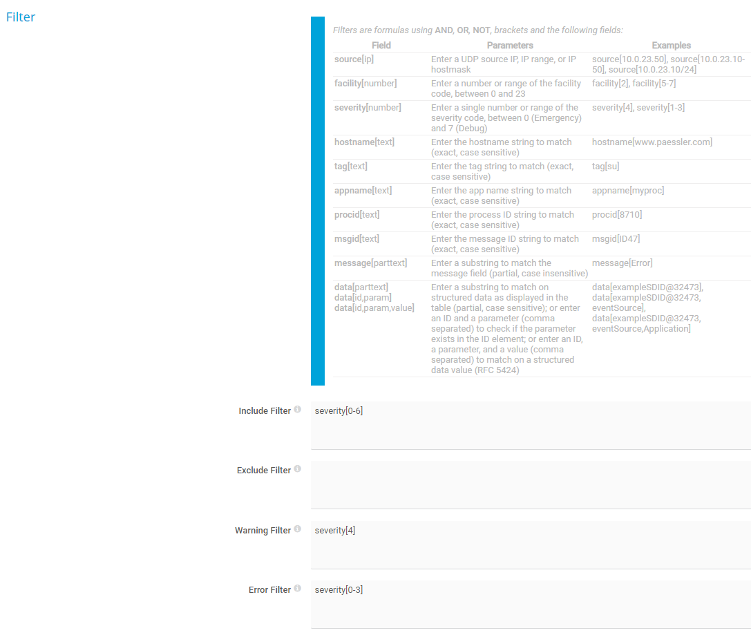 Define if you want to filter Syslog messages. If you leave this field empty or use the keyword any, the sensor processes all data. To only include specific types of messages, define filters using a special syntax.