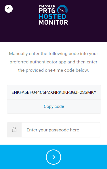 After you set up multifactor authentication, the next time you log in to the PRTG Hosted Monitor Customer Portal, you see an additional login screen.
